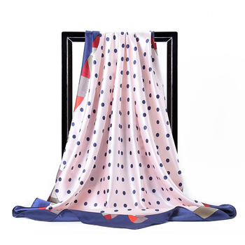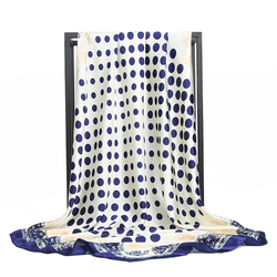 Bufanda de satén blanca cuadrada grande para mujer con patrón de lunares azul marino envoltura para la cabeza de moda