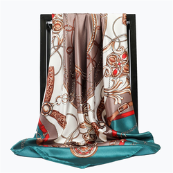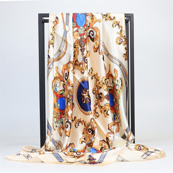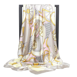 Pañuelo cuadrado de 90cm de seda de imitación de poliéster con estampado de carro de cadena Beige de lujo para uso diario de mujer