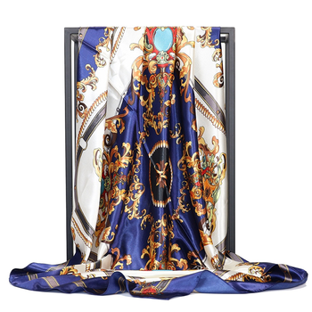 Bufanda de seda de imitación cuadrada de 90cm con estampado de cadena barroca dorada azul oscuro para mujer