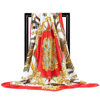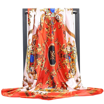 Pañuelo de cabeza de satén con estampado de cadena barroca naranja roja para mujer, pañuelo para el pelo, 90cm