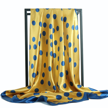 Bufanda de satén cuadrada con estampado de lunares grandes, amarillo dorado y azul real para mujer, pañuelo para el pelo de la cabeza