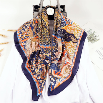 Bufanda de seda cuadrada con estampado de motivos históricos de lujo en azul marino y naranja para regalo de mujer y decoración de moda