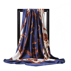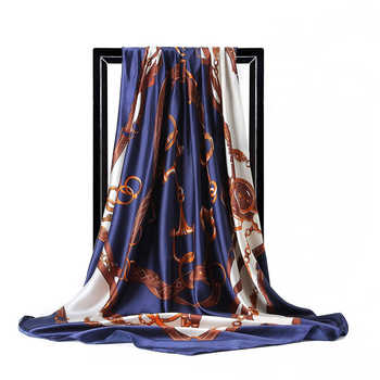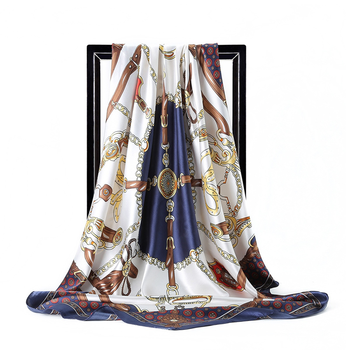 Clásico azul marino blanco oro hebilla cadena estampado satén seda 90cm cuadrado mujer cuello bufanda