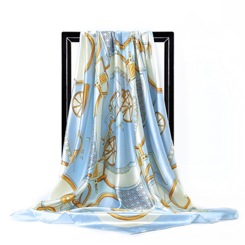 Pañuelo para cabeza de mujer de seda satinada cuadrada de 90cm con estampado de carro ecuestre blanco azul cielo