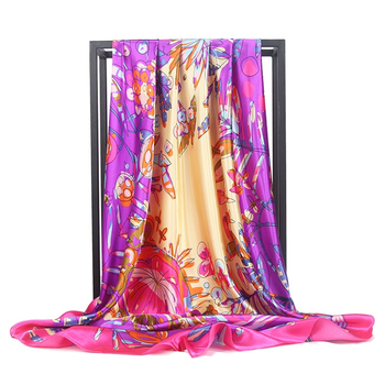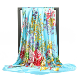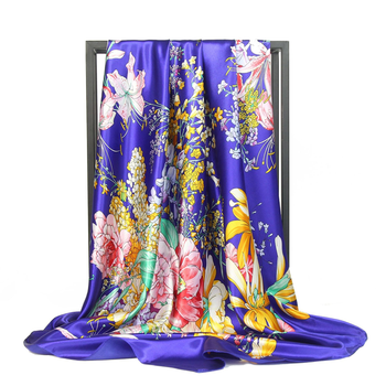 Venta al por mayor de verano nueva moda europea americana viento flor patrón Impresión logotipo personalizado 90 90 bufanda cuadrada señoras material satinado