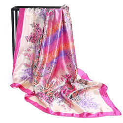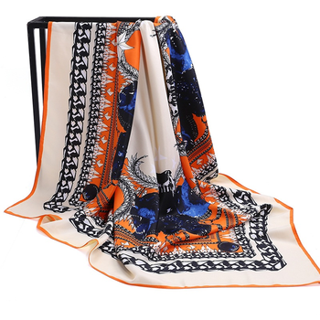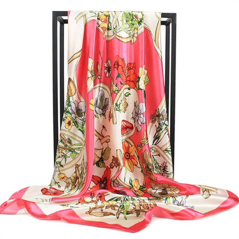 Estate all'ingrosso nuova moda europea americana stampa del modello di fiore del vento Logo personalizzato 90 90 sciarpa quadrata da donna materiale satinato